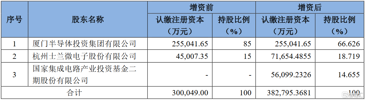 公司拟与国家集成电路产业投资基金二期股份有限公司(“大基金二期”)以货币方式共同出资8.85亿元认缴士兰集科本次新增的全部注册资本,其中:公司出资2.85亿元认缴新增注册资本266,471,355元;大基金二期出资6亿元认缴新增注册资本560,992,326元。此次增资溢价部分计入士兰集科的资本公积。士兰集科另一方股东厦门半导体投资集团有限公司(“厦门半导体”)放弃优先认购权。此次增资完成后,士兰集科的注册资本将由3,000,490,000元增加为3,827,953,681元。