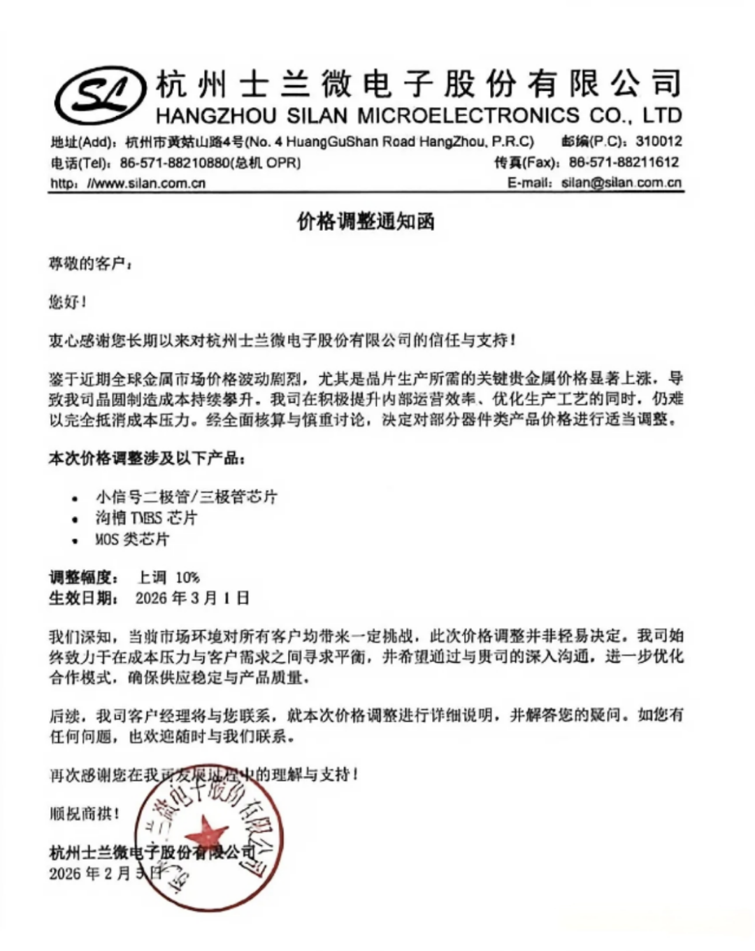 近日,国内功率半导体龙头企业士兰微正式发布价格调整通知,明确自2026年3月1日起,对旗下小信号二极管/三极管芯片、沟槽TMBS芯片、MOS类芯片等核心功率器件产品统一上调价格10%。这一举措不仅是企业应对成本压力的必然选择,更成为国内半导体行业全产业链涨价潮的又一重要信号,叠加此前多家国内外厂商的提价动作,行业上行周期特征愈发明显。
