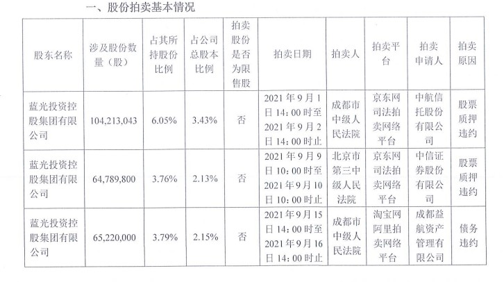 蓝光发展公告称,收到控股股东蓝光集团通知,其所持部分公司股份将于9月进行共公开拍卖。蓝光集团持有公司股份1721396220股,占公司总股本的56.72%。本次拟被司法拍卖的股份为蓝光集团持有的公司无限售条件流通股23422843股,占公司总股本的7.72%。目前拍卖事项尚在公示阶段,后续可能将涉及竞拍、缴款、法院执行法定程序、股权变更过户等环节,存在一定的不确定性。公司将根据最终结果,依法履行相应的信息披露义务。若本次拍卖成功,不会导致公司控股股东和实际控制人发生变化。