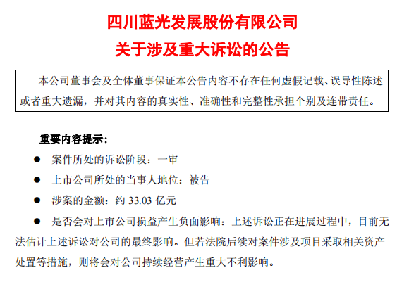同一天,蓝关还发布了一则涉及重大诉讼的公告,表示近期,部分金融机构及合作方向其提起了诉讼,本次新增涉案金额合计 33.03 亿元。