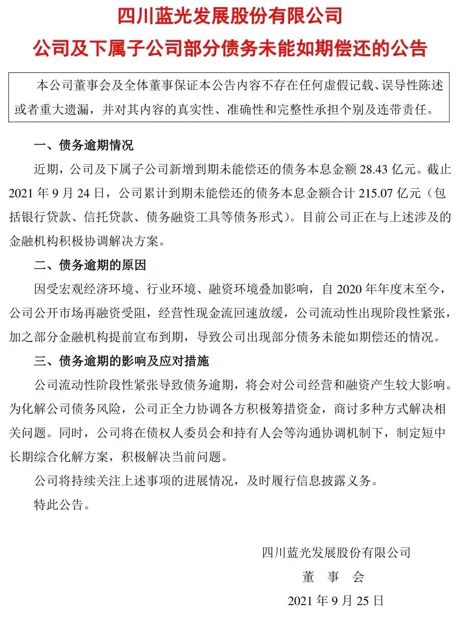 9月25日,蓝光发展发布公告称,近期,公司及下属子公司新增到期未能偿还的债务本息金额28.43亿元。截止9月24日,累计到期未能偿还的债务本息金额合计215.07亿元(包括银行贷款、信托贷款、债务融资工具等债务形式)。目前正在与上述涉及的金融机构积极协调解决方案。