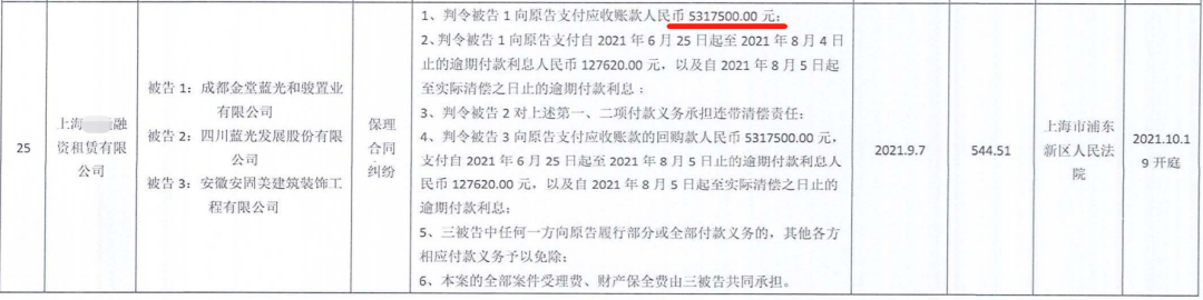 公告罗列了30个诉讼案件,而蓝光发展收到起诉状或申请书的时间集中在2021年8月份至2021年9月份之间,其中有两起诉讼案由为“融资租赁合同纠纷”:
