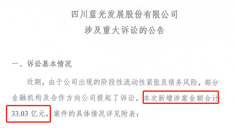 9月26日,蓝光发展发布《蓝光发展涉及重大诉讼的公告》称,“近期,由于公司出现的阶段性流动性紧张及债务风险,部分金融机构及合作方向公司提起了诉讼,本次新增涉案金额合计33.03亿元。”