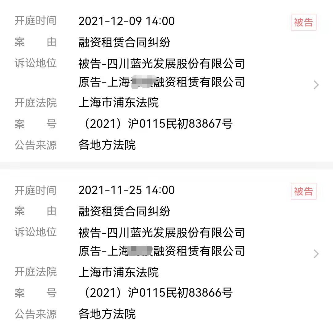 今年已有多家房企先后出现债务违约现象,今日又传出四川蓝光发展股份有限公司(以下简称“蓝光发展”)再因融资租赁纠纷新增两起开庭公告。