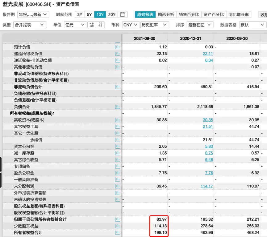 根据其三季报数据,截止到今年9月30日,蓝光发展全部股东权益只有198.1亿元,较年初减少了265.86亿元。