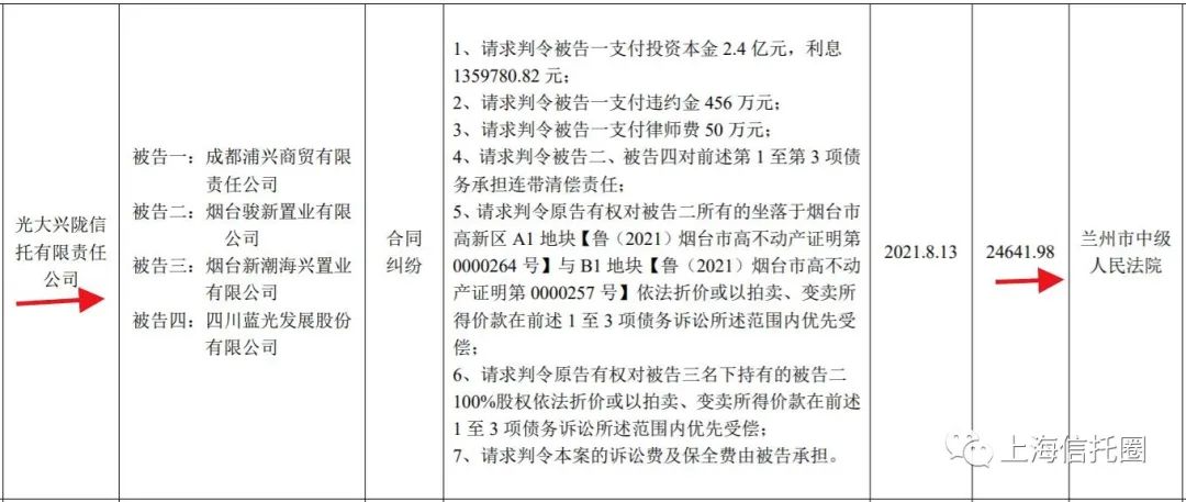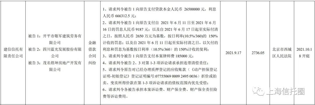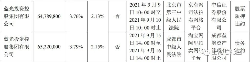 另外,上海信托圈关注到,蓝光发展于10月19日还披露称,控股股东蓝光集团所持6478.98万股在京东网司法拍卖网络平台被公开拍卖,这些股份已经完成过户登记。而早在9月18日,蓝光发展就披露称蓝光集团累计被冻结股份超12亿股,大约占总股本的四成。