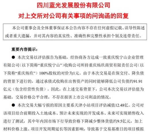 延迟四天后,蓝光发展做出回复。关于交易作价仅为1元的原因及合理性,蓝光发展回复称,该交易的主要目的是为了解决困难项目的建设和交付问题,是在保交付、降负债的背景下进行的,通过承债式收购在出售资产,同时能够降低公司负债约91.91亿元(包含经营性负债)。因此,在上述交易背景下,该交易以评估值为基础,交易价格公平合理,不存在损害上市公司利益的情况。