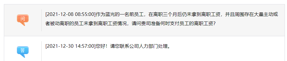 在互动问答平台中,蓝光发展还遭遇了前员工讨薪。