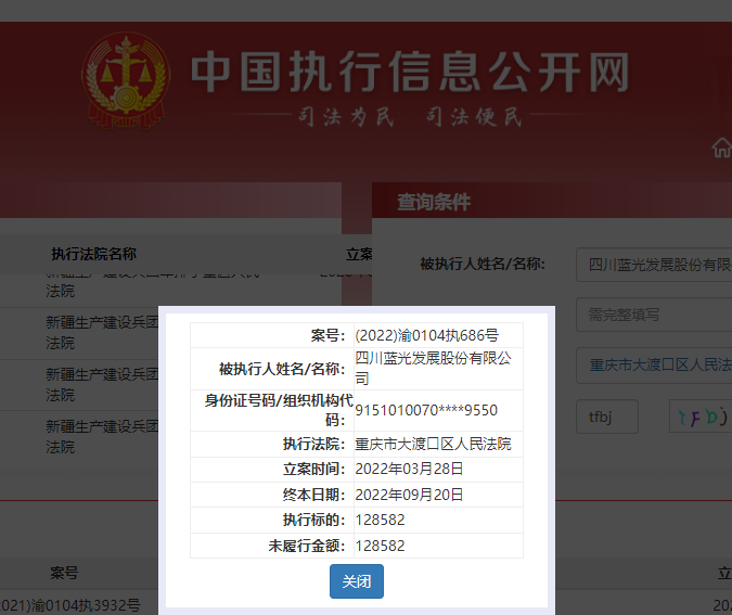 9月20日,四川蓝光发展股份有限公司新增一则终本案件,案号为(2022)渝0104执686号,未履行金额为128582元,执行法院为重庆市大渡口区人民法院。