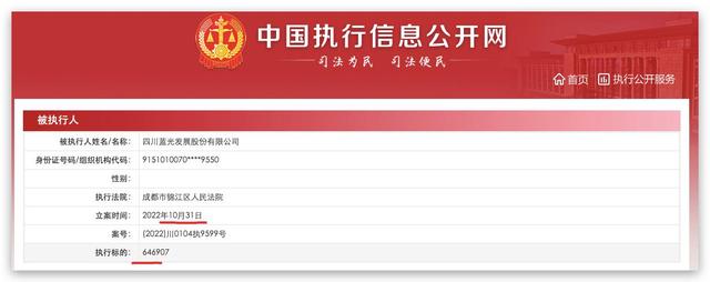 具体来看,10月31日,案号(2022)川0104执9599号,执行标的为646907元,执行法院为成都市锦江区人民法院。