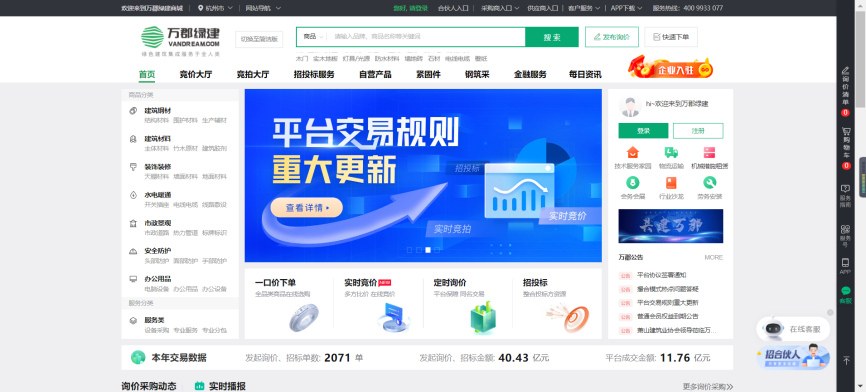点开万郡绿建在线商城,入目便是绿白相交、精致简洁的交互界面,采购、询价、竞标等多功能服务板块,700多种建筑建材品类汇集于此,供采购双方自由交易。在历经互联网浪潮6年的“洗礼”下,万郡绿建商城不仅仍有着强劲的竞争力,还成为促进钢结构上下游企业交流、交往、交易的综合平台。