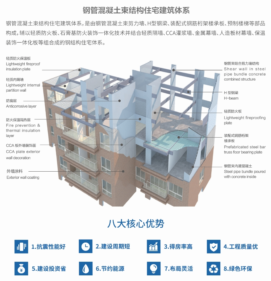 杭萧钢构自主研发的第三代钢结构住宅体系——钢管混凝土束结构住宅建筑体系,是杭萧钢构通过多年自主创新和科技研发的一项重要科技成果,由钢管混凝土束剪力墙、H型钢梁、装配式钢筋桁架楼承板等主体结构组成,拥有抗震减灾、节能减排、得房率高、建设周期短、布局灵活等优势和亮点,引领住宅建设新风尚。