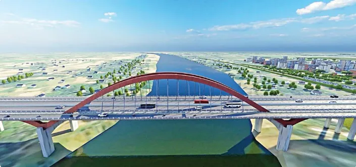 该项目位于孟加拉国北部重要交通枢纽迈门辛市,横跨布拉马普特拉河支流,是连接当地城乡经济圈的关键纽带。大桥主桥长320米,宽42.15米,为三孔钢箱拱桥;其中180米主跨为中承式吊杆钢拱桥采用顶进法施工,施工技术含量高。项目建成后将极大缓解区域交通压力,提升物流效率,为当地农业、制造业发展提供有力支撑。