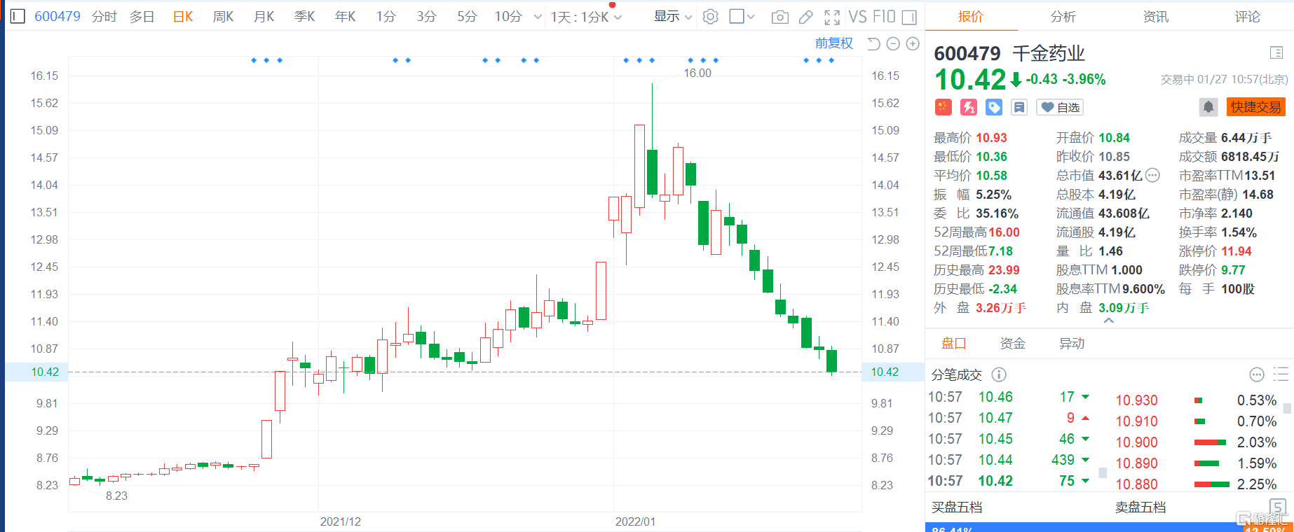 千金药业(600479.SH)跌近4%,报10.42元,暂录九连跌,区间跌幅达23%,总市值44亿元。