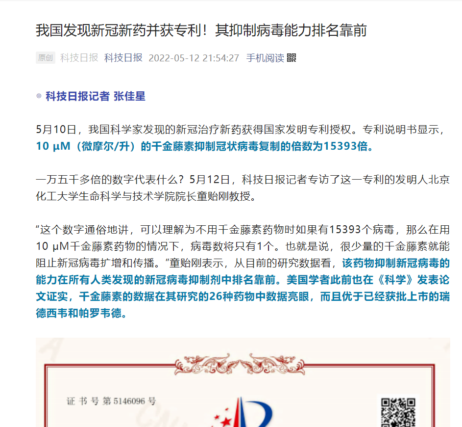 让资本狂欢的背后是一则千金藤素具有抗新冠效果的消息。消息称,北京化工大学生命科学与技术学院院长童贻刚教授发现的新冠治疗新药获得国家发明专利授权。专利说明书显示,10uM(微摩尔/升)的千金藤素抑制冠状病毒复制的倍数为15393倍。