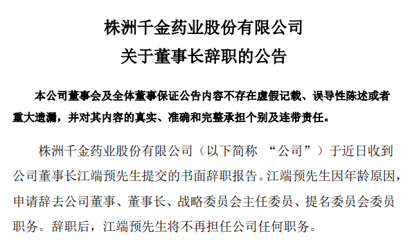 昨日晚间,株洲千金药业股份有限公司(“千金药业”600479.SH)发布的“关于董事长辞职”公告称,近日收到董事长江端预提交的书面辞职报告。江端预因年龄原因,申请辞去公司董事、董事长、战略委员会主任委员、提名委员会委员职务。辞职后,江端预将不再担任公司任何职务。