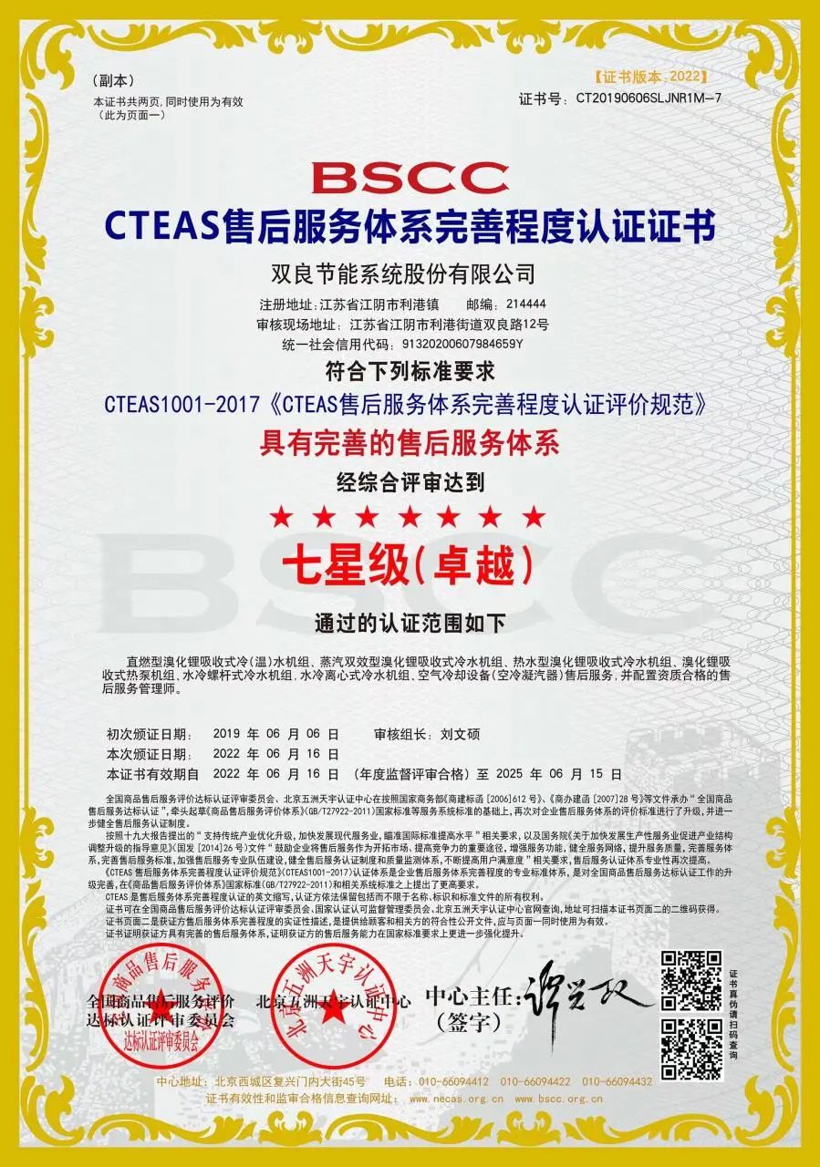双良节能凭借完善的服务体系斩获“全国国标五星级售后服务企业”、“全国售后服务企业TOP10”、“全国顾客满意十大品牌”三大荣誉,为行业树立了服务模式的创新标杆。