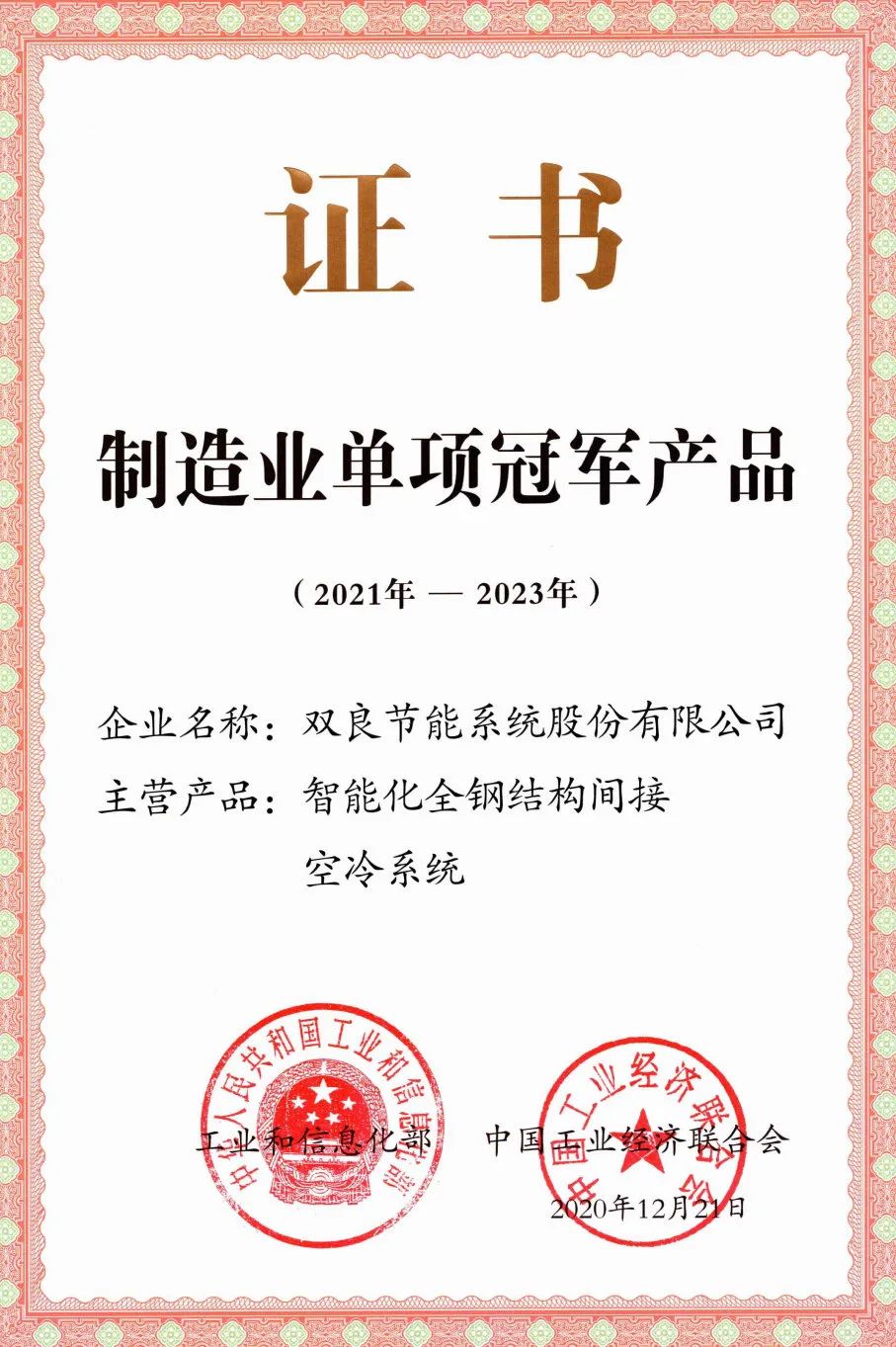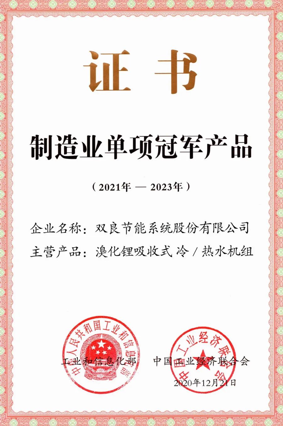 双良溴化锂吸收式冷/温水机组、智能化全钢结构间接空冷系统,荣获由工信部、中国工业经济联合会共同颁发的“中国制造业单项冠军产品”证书。
