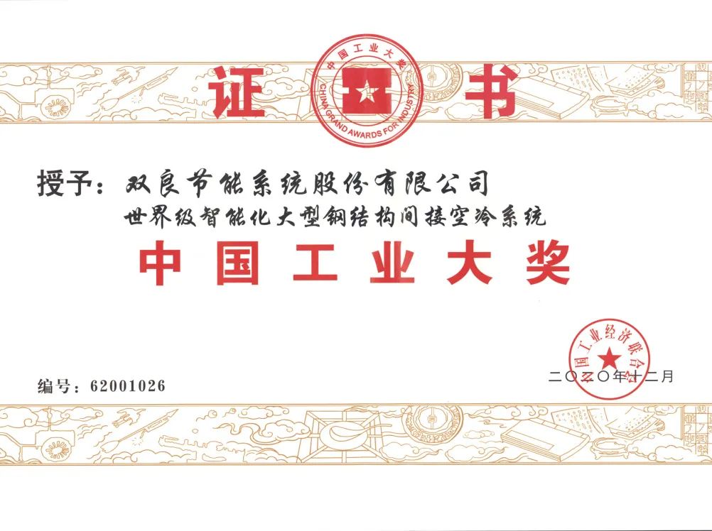 “双良智能化全钢结构间接空冷系统”荣获 2020 年“中国工业大奖项目奖”和制造业“单项冠军产品”两项国家大奖。