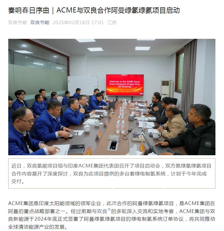 近日,双良氢能项目组与印度ACME集团代表团召开了项目启动会,双方就绿氢绿氨项目合作内容展开了深度探讨,双良为此项目提供的多台套绿电制氢系统,计划于今年完成交付。