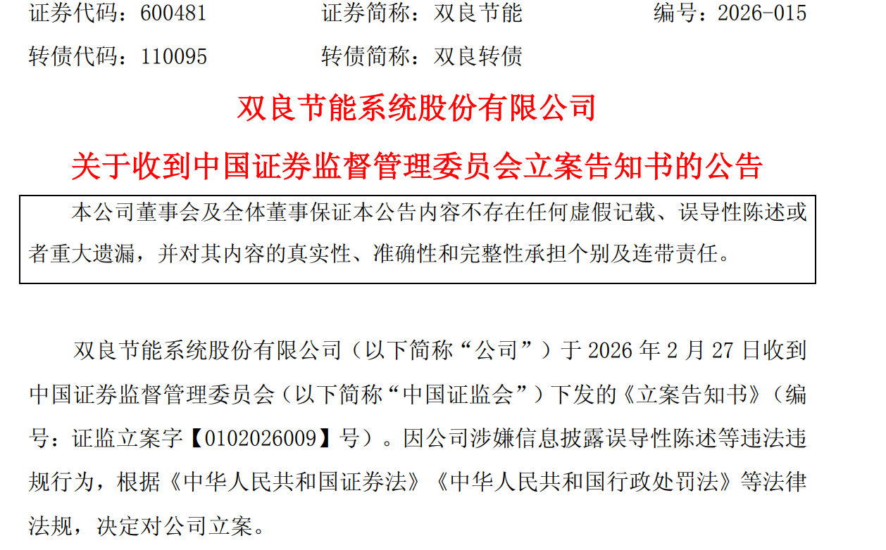 近日,双良节能发布公告称,公司于2026 年2月27日收到证监会下发的《立案告知书》(编号:证监立案字【0102026009】号)。因公司涉嫌信息披露误导性陈述等违法违规行为,根据《中华人民共和国证券法》《中华人民共和国行政处罚法》等法律法规,决定对公司立案。