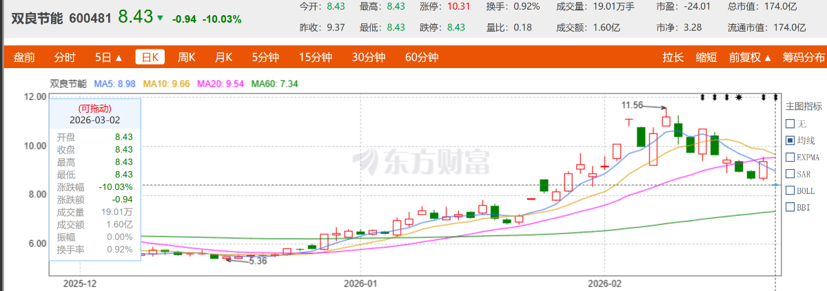 3月2日,双良节能开盘即跌停,股价报收8.43元,下跌10.03%。