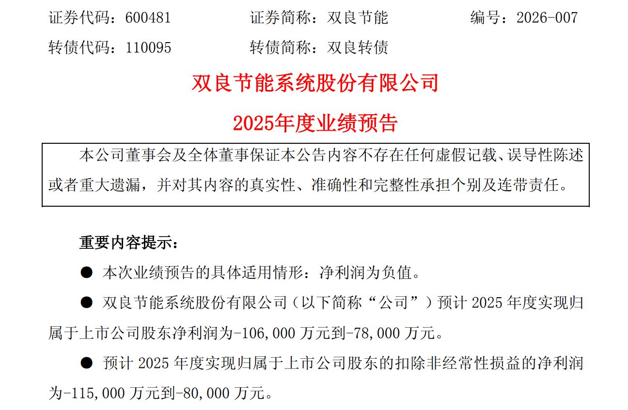 双良节能发布的业绩预告显示,公司预计2025 年度实现归属于上市公司股东净利润为-106,000 万元到-78,000 万元;预计 2025 年度实现归属于上市公司股东的扣除非经常性损益的净利润为-115,000 万元到-80,000 万元。