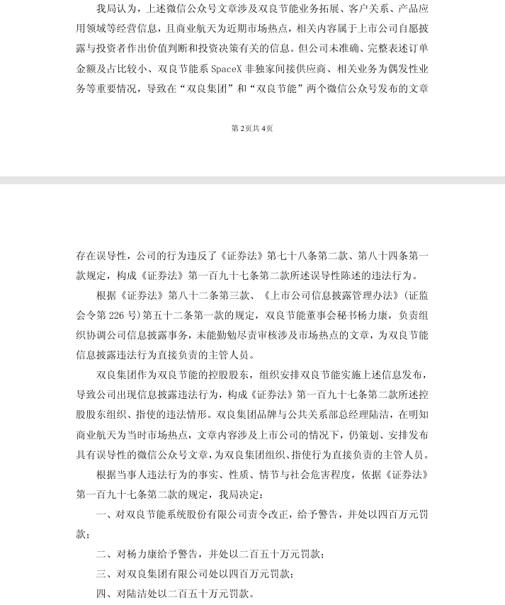 经查,双良节能及其控股股东双良集团有限公司(以下简称“双良集团”)于2026 年 2 月 12 日通过微信公众号发布文章,宣称获得 SpaceX 相关订单。然而,上述文章未准确、完整披露订单金额较小、系非独家间接供应商等重要信息,构成误导性陈述。基于此,证监会依法对双良节能、双良集团分别处以400万元罚款;对时任董事会秘书杨力康、双良集团品牌与公共关系部总经理陆洁分别处以250万元罚款。上述罚款合计1300万元。