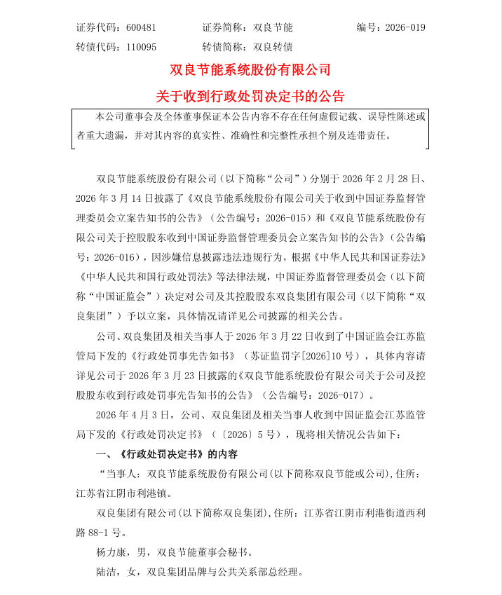 近日,双良节能系统股份有限公司(证券代码:600481,证券简称:双良节能)因信息披露违规收到行政处罚决定书。据上海证券交易所网站2026年4月3日披露,该公司发布公告称,已收到证监会下发的《行政处罚决定书》(〔2026〕5号)。