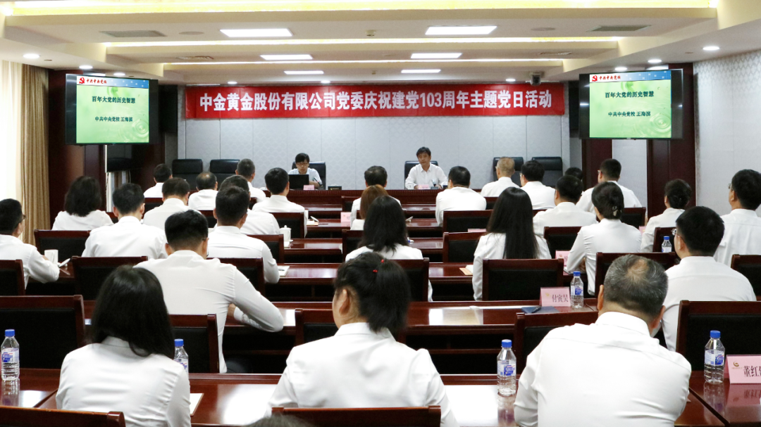 在中国共产党成立103周年之际,为重温党的光辉历史,回顾党的奋斗历程,讴歌党的丰功伟绩,弘扬伟大建党精神,从党的历史中汲取智慧和力量,7月1日,中金黄金股份有限公司党委组织开展“庆七一、忆初心、担使命、建新功”主题党日活动,本次活动特邀中共中央党校(国家行政学院)马克思主义学院教授王海滨讲授《百年大党的历史智慧》为题的专题党课,中金黄金党委书记、总经理贺小庆主持活动。