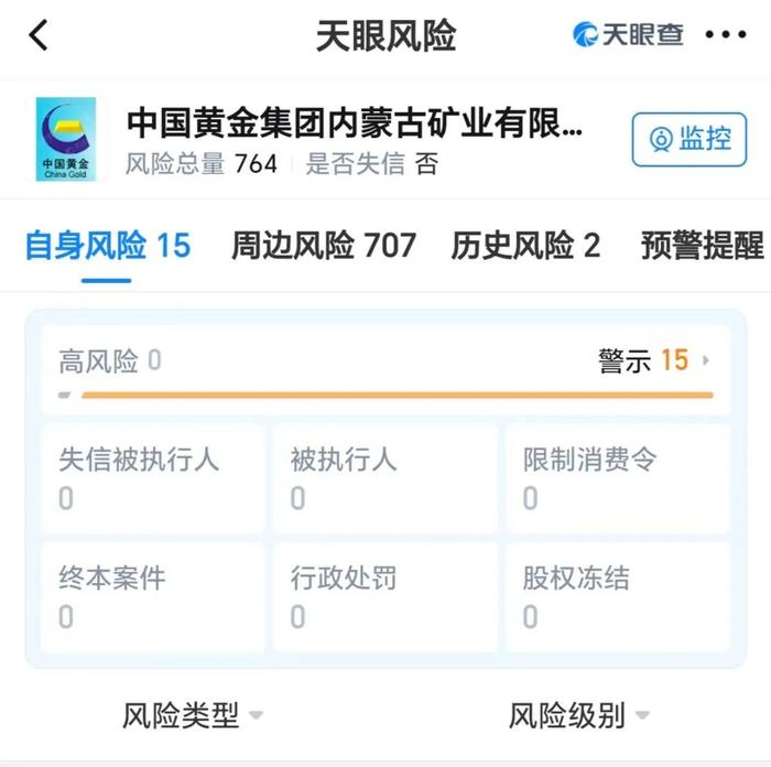 新快报记者通过天眼查了解到,涉事的中国黄金集团内蒙古矿业有限公司,注册资本4亿元,成立于2005年11月,中金黄金持有其90%的股权。天眼查深度风险信息显示,该公司风险信息总量有764件,其中包括合同纠纷、股权转让纠纷和劳动关系纠纷等。其中,2021年2月,呼伦贝尔市应急管理局在抽查检查中“发现隐患18条”,2021年7月“发现隐患9条”。2024年8月,内蒙古矿业的关联公司内蒙古金域凤形矿业耐磨材料有限公司因“生产经营单位使用淘汰设备类”违反了相关安全生产法被处罚。除此之外,中金黄金旗下有多家公司曾因安全问题被罚。如2024年10月,中金建设包头分公司、项目部违反安全生产管理制度,雇佣并安排患有高血压的工人进行高处作业等问题被罚60万元等。