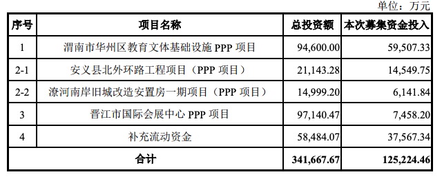 募集资金将用于以下项目,原华阴市文化体育运动中心PPP项目从本次募集资金用途中去除。