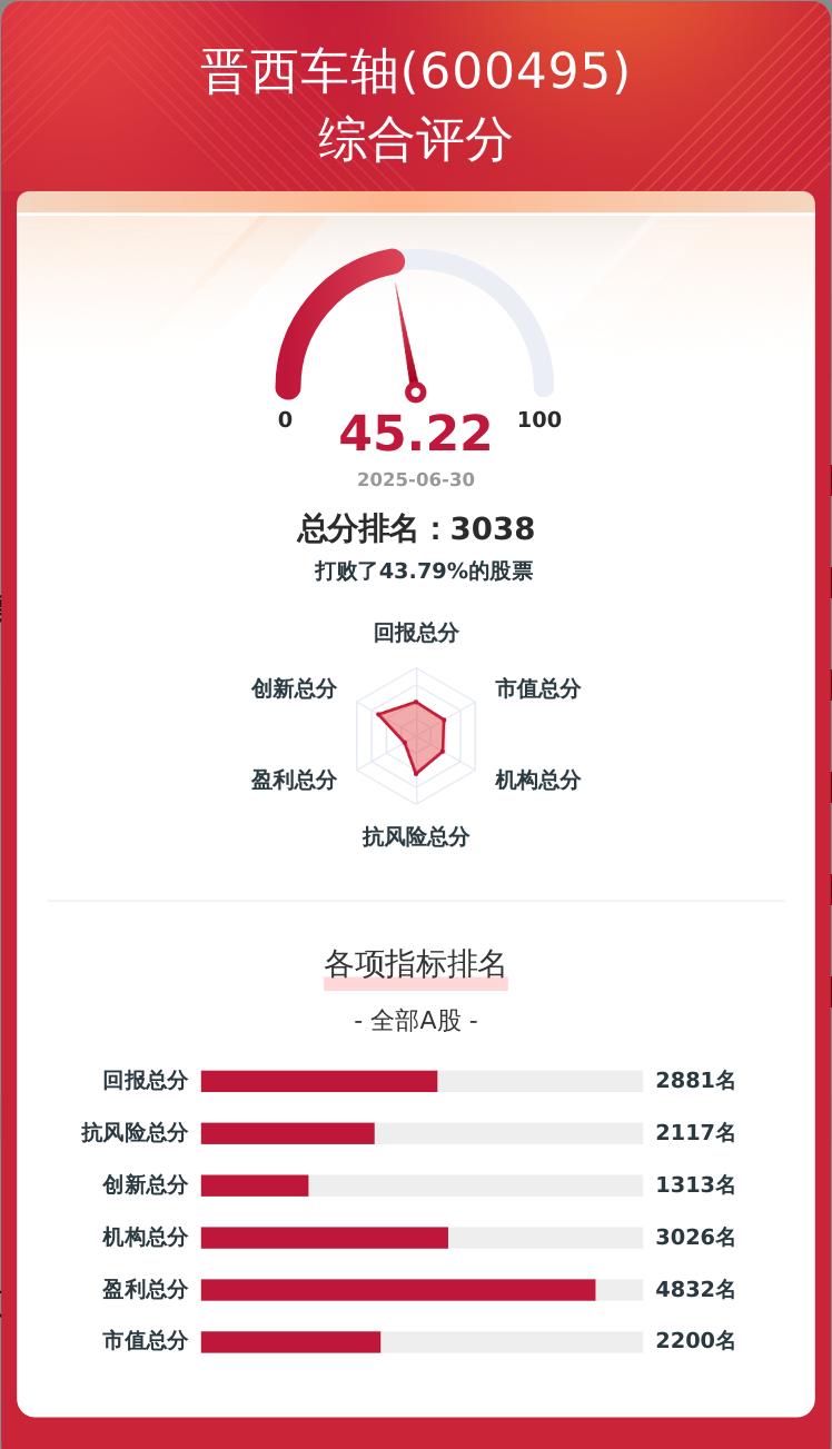 金融界上市公司研究院构建了一套上市公司韧性评价体系,从企业盈利、科技创新、股东回报、经营抗风险、市值表现及机构吸引力六个维度对企业进行量化评分,满分为100分。晋西车轴的韧性评价总分为45.22分,在A股5405家可比上市公司中排名第3038位。