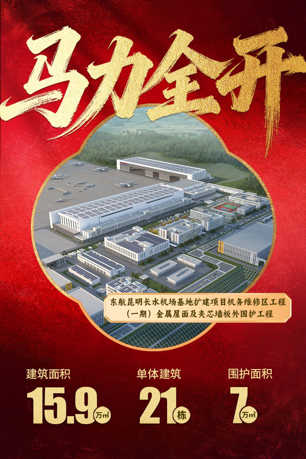 东航昆明长水机场基地扩建项目机务维修区工程位于昆明长水机场用地红线内,一期工程总建筑面积约15.9万㎡,包含21栋建筑单体。此次中标,是精工钢构继上海东航机库之后公司承接的又一重要机库工程,涵盖金属屋面及夹芯墙板外围护工程。