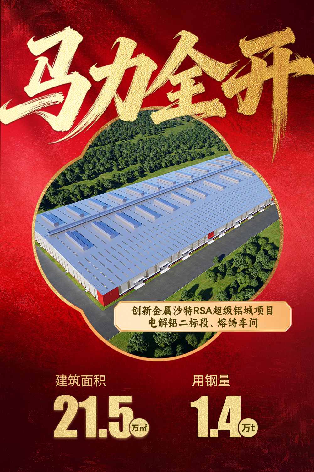 创新金属沙特RSA超级铝城项目位于沙特麦地那省延布工业区,共包括电解铝车间、综合仓库、综合维修车间、熔铸车间等12栋单体,总用钢量超1.4万t,是中国企业参与中东高端工业市场的重要突破,对推动全球铝业低碳转型、深化中沙产能合作具有标志性意义。