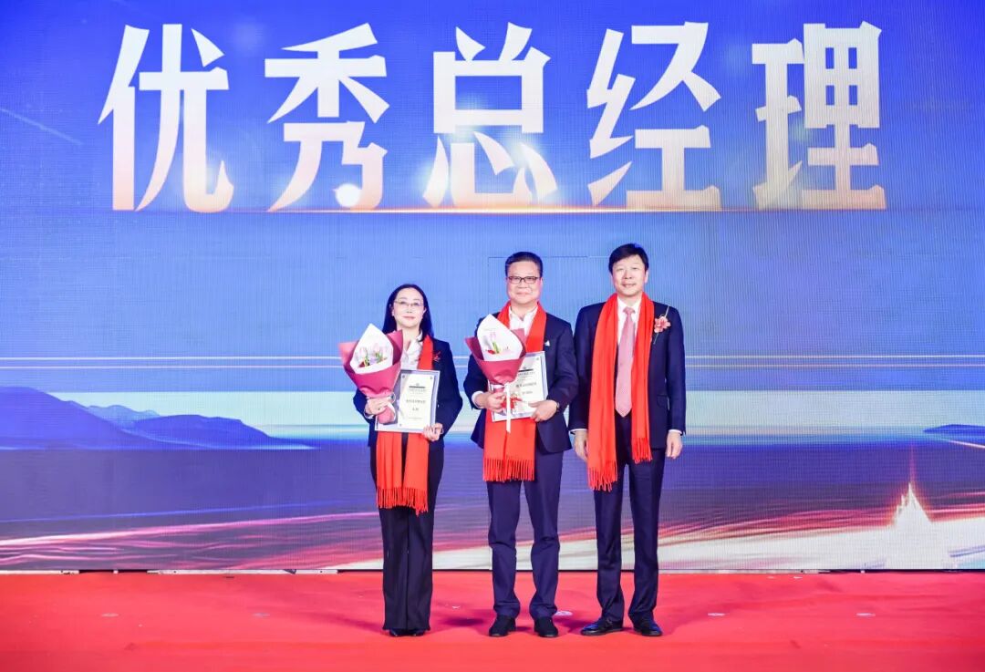 星光之门缓缓开启,在全场热烈的掌声中,本年度优秀总经理-金奖获得者精工国际总经理王煦女士、优秀总经理-银奖获得者精工工业总裁洪国松先生迎着高光、闪亮登场,集团董事长兼总裁方朝阳先生为两位优秀总经理颁奖。