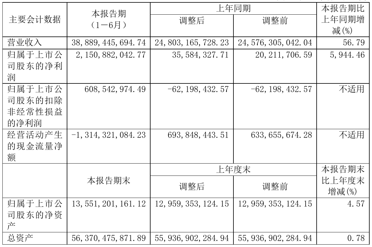 挖贝网8月27日,中化国际(600500)近日发布2021年半年度报告,报告期内营业收入38,889,445,694.74元,同比增加56.79%;净利2,150,882,042.77元,同比净利增加5,944.46%。