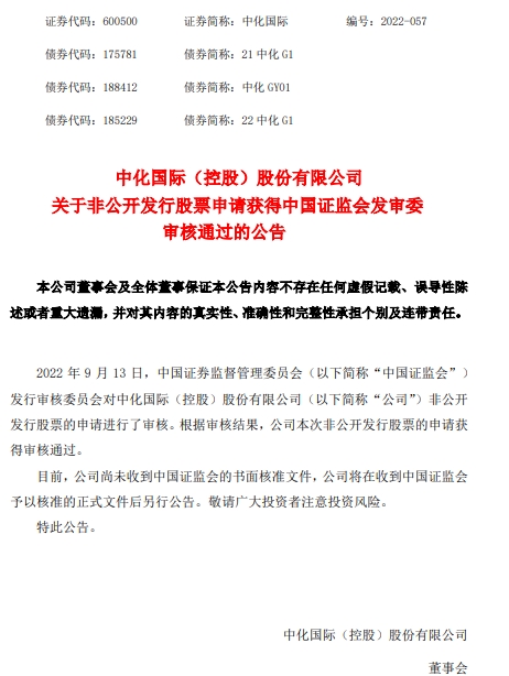 中国经济网北京9月14日讯中化国际(600500.SH)昨晚公告称,昨日,中国证监会发行审核委员会对公司非公开发行股票的申请进行了审核。根据审核结果,中化国际本次非公开发行股票的申请获得审核通过。