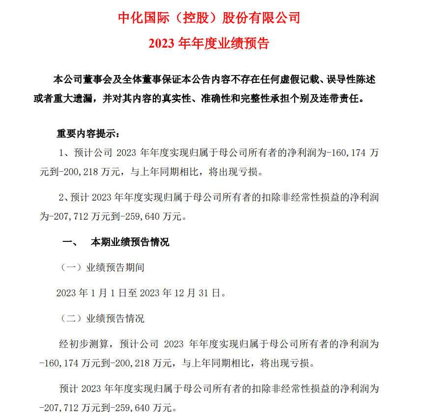 公告显示,经初步测算,中化国际预计2023年年度实现归属于母公司所有者的净利润为-160174万元到-200218万元,与上年同期相比,将出现亏损;预计2023年年度实现归属于母公司所有者的扣除非经常性损益的净利润为-207712万元到-259640万元。