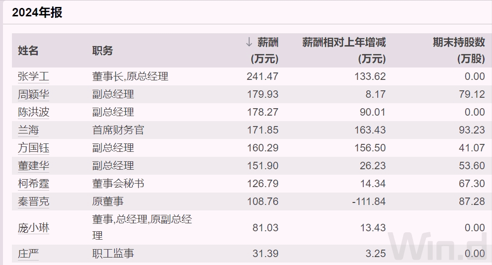 根据年报披露,2024年,时任董事长兼总经理张学工薪酬超过241万元,比2023年增加约134万元,为最高;其余高层薪酬低于200万元,现任董事长兼总经理庞小琳薪酬81万元。