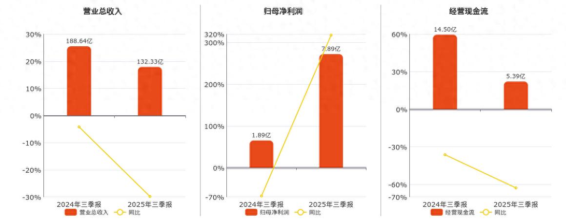 公司营业总收入为132.33亿元,较去年同报告期营业总收入减少29.93亿元,同比较去年同期下降18.45%。归母净利润为7.89亿元。经营活动现金净流入为5.39亿元,较去年同报告期经营活动现金净流入减少9.10亿元,同比较去年同期下降62.78%。
