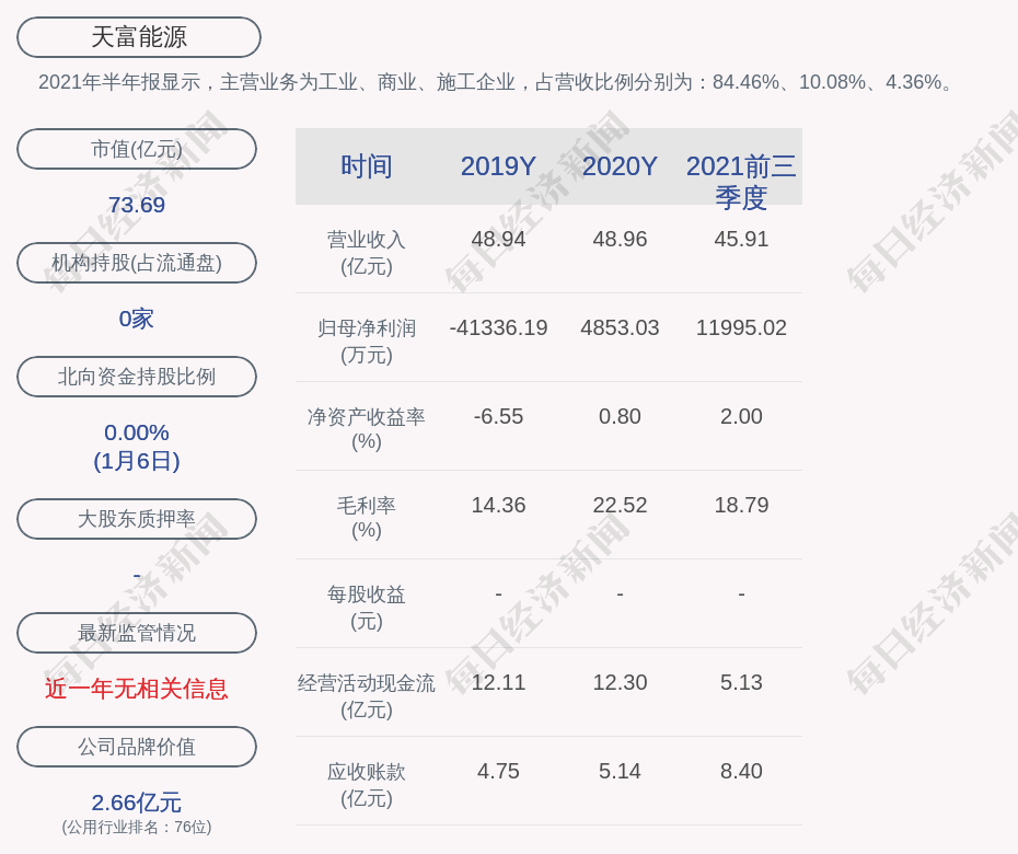 2021年半年报显示,天富能源的主营业务为工业、商业、施工企业,占营收比例分别为:84.46%、10.08%、4.36%。