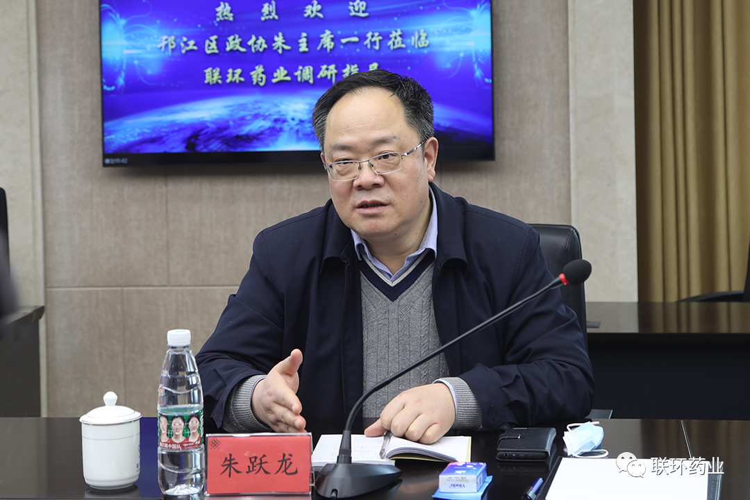 3月30日下午,邗江区政协主席朱跃龙一行赴联环药业调研指导,高新区相关领导陪同调研,联环药业董事长吴文格、总经理钱振华、党委副书记涂斌及相关管理层参与接待。