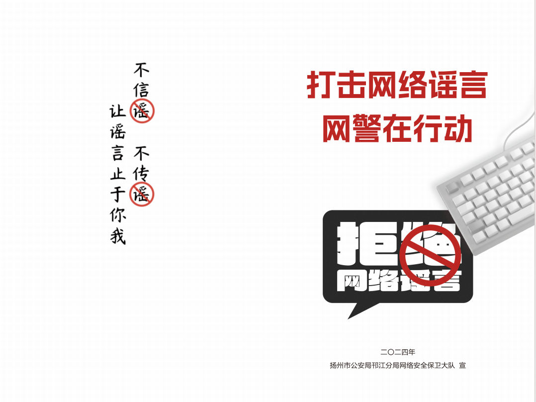 网络空间是亿万网民共同的精神家园。网络谣言不仅污染网络环境、损害网民权益,还危害国家安全和社会稳定,整治网络谣言乱象是广大网民的共同心声。为治理网络谣言,加强警民联动,形成全社会共同抵制、共同治理网络谣言的良好局面,江苏网警联合互联网平台发出如下倡议: