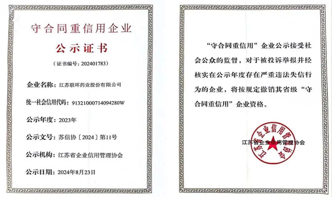 近日,江苏省企业信用管理协会授予联环药业2023年度省级“守合同重信用”企业证书,这是公司自2021年起连续第三年获此殊荣。这标志着联环药业在业界树立的良好信誉再次被认可,也是对联环药业履行国企责任、彰显国企担当的有力褒奖。