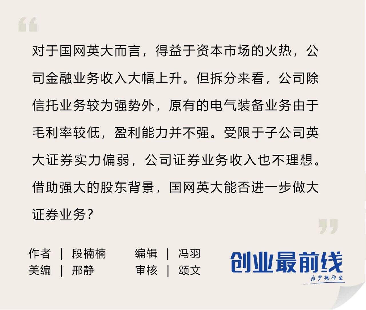 对此,「创业最前线」试图向国网英大了解,近期子公司英大证券迎来新任董事长,其在国家电网金融体系拥有较为丰富的从业经验,随着新任董事长的到来,英大证券能否得到国家电网更多的资源支持?除此之外,公司计划如何提升公司证券业务收入?截至发稿,未获得国网英大回应。