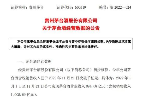 11月21日晚间,贵州茅台发布公告称,2022年1月1日至11月21日,实现茅台酒营业收入894.08亿元,含税销售收入1005.69亿元,破千亿元大关。