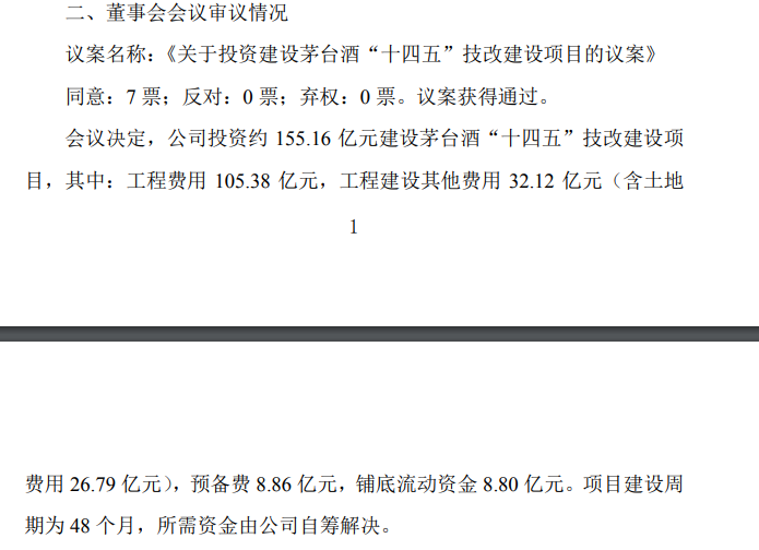 另一方面,在分红方案获得审议通过当日,贵州茅台召开董事会,审议通过相关议案,拟自筹资金约155.16亿元投资建设茅台酒“十四五”技改建设项目。项目位于茅台镇太平村和中华村,建设周期48个月,建成后可新增茅台酒实际产能约1.98万吨/年,储酒能力约8.47万吨。