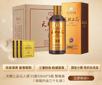 目前在电商平台的天朝上品“自营专区”,依旧能找到有“贵州茅台集团”标识的“众人酒”,每件(500ml*6)售价414元,每瓶约70元。
