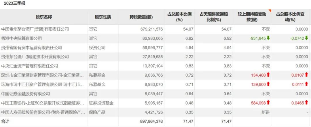 贵州茅台2023年三季报显示,截至2023年9月末,前十大流通股股东当中并无“东莞证券东莞长安分公司”的身影,第十大流通股股东为“中国人寿-传统-普通保险产品-005L-CT001沪”,持股数量为442.17万股。